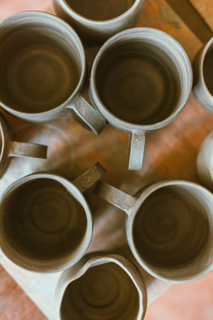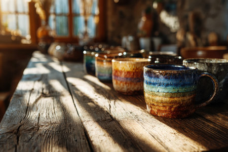 Handcrafted ceramic mugs lined on wooden table showcasing earthy tones and artisanal design in a bright and spacious pottery studio setting
