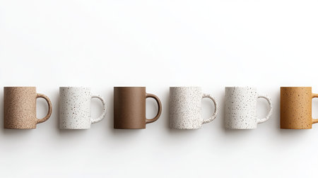 A stylish arrangement of rustic ceramic mugs in various earthy tones sitting on a white surface. Perfect for coffee or tea lovers. Ideal for home decor.