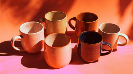 A vibrant assortment of ceramic mugs displayed against a vivid orange backdrop, highlighting their unique shapes, textures, and inviting colors, perfect for any modern kitchen.