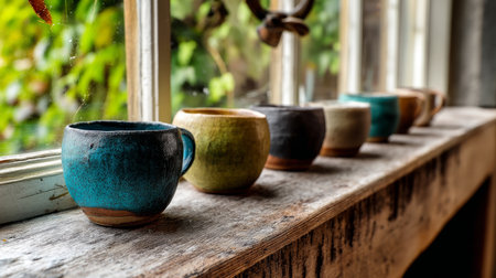 A row of handmade ceramic mugs in various shades of blue and green sits on a wooden window sill to dry. Sunlight streams through the window, highlighting the glazed textures and drips on the pottery. This peaceful still life showcases the beauty of artisanal craft and pottery studio vibes.