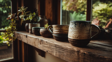 Handmade eco-friendly pottery cups on a wooden shelf with a rustic kitchen backdrop and a window revealing a green garden.