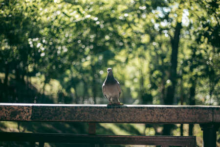 Pigeon on a wooden background. Pigeon in the park