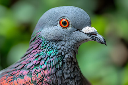 Detailed close-up of a pigeon showcasing its vibrant, multi-colored plumage and striking red eye. background is a natural green blur, accentuating the bird's detailed feathers and sharp beak, perfect for wildlife and nature photography enthusiasts. Generative AI