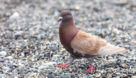 A pigeon walks on a stone pebble by the sea. Close-up