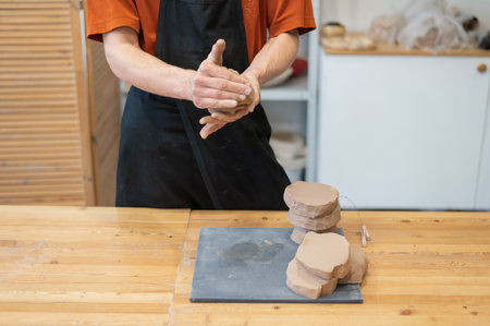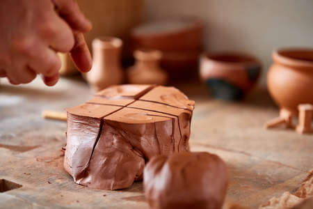 Adult male potter master preparing the clay on table. Front view, closeup, hands only. Art and business, hobby and freelance working concept.