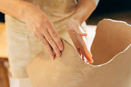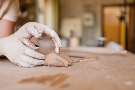 Womens hands knead clay, drawing elements of the product. Production of ceramic products at the master class on ceramics.