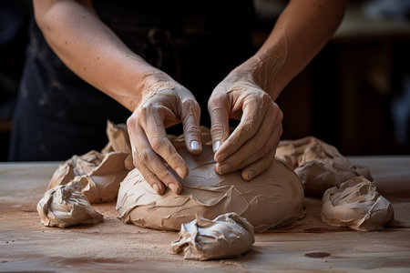Pottery artist shaping clay, blurred background of a pottery wheel.