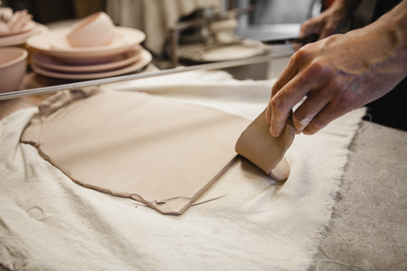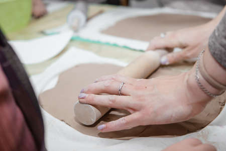 Woman's hands makes clay plates in pottery workshop, close up view; focus on stained hand