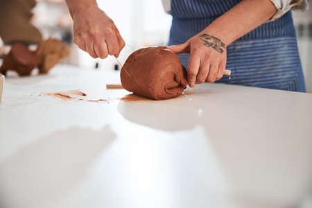 Adult male potter master cutting the clay on table. Top view, closeup, hands only. Art and business, hobby and freelance working concept.