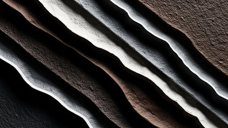 Diagonal wavy bands of textured in dark gray white and brown are illuminated by dramatic light casting deep shadows creating an abstract organic pattern.
