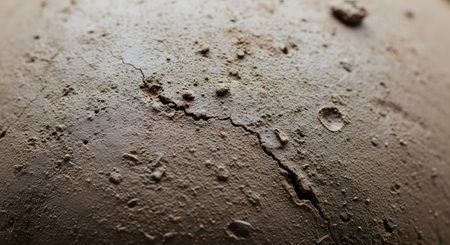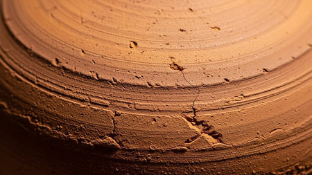 Macro view of rough terracotta clay showing concentric rings from pottery wheel and natural cracks.