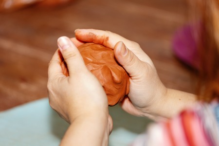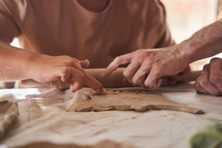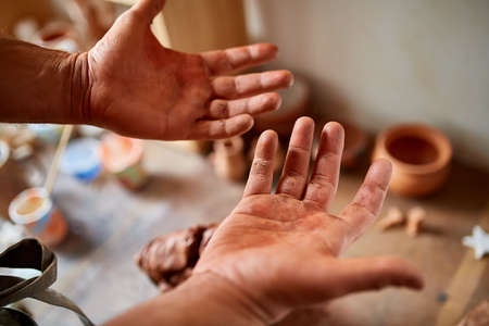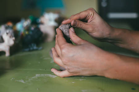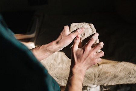 Adult male potter master preparing the clay on table. Front view, closeup, hands only, unrecognizable. Art and business, hobby and freelance working concept.
