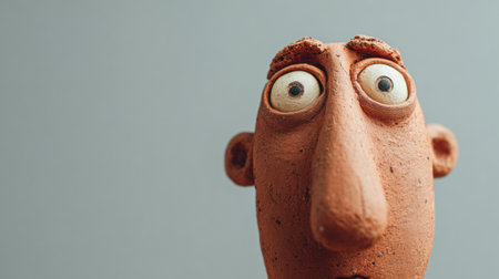 A whimsical clay character with exaggerated features and wide eyes stands out against a simple background, showing its artistic detail.
