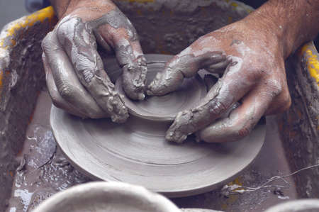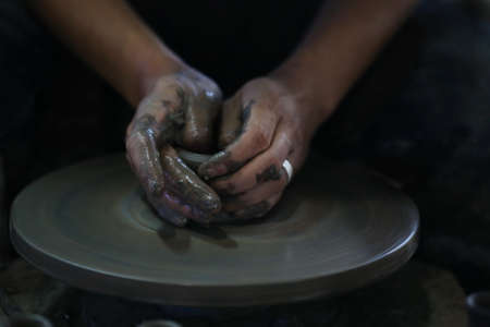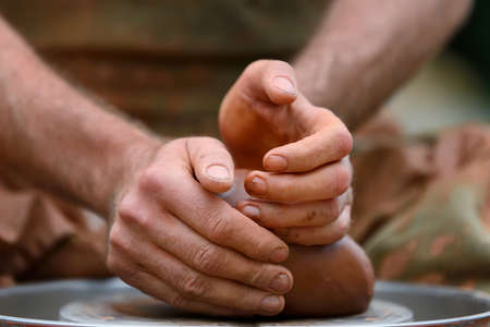 Craftsman hands kneads clay for making pottery bowl. Man working on potter wheel outdoor