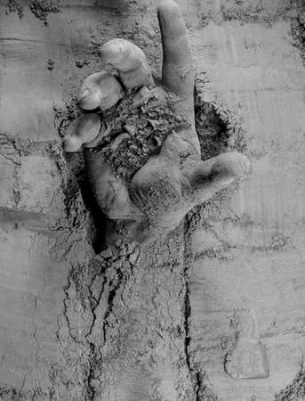 Human hand rising up and reaching from cement. Human power and Labor day concept.