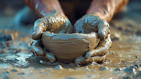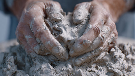A close-up view of two hands covered in wet, slippery clay during the pottery-making process. Water droplets glisten on the skin, highlighting the messy and tactile nature of sculpting and ceramic art. This image represents creativity and craftsmanship.