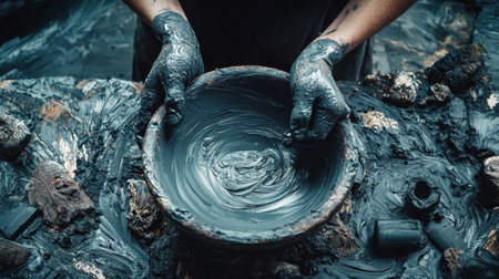 Closeup of hands mixing thick, dark paint in a rustic bowl, surrounded by textured paint and materials. The artistic scene highlights creativity and the tactile nature of art creation.
