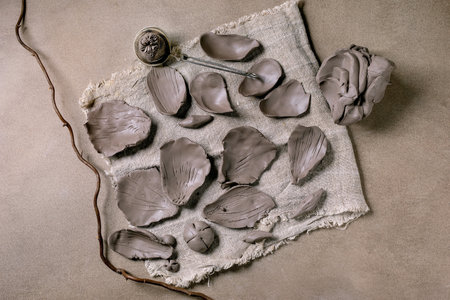Creating a Clay Flower: DIY ceramic Workshop Idea. Petals and buds prepared for crafting magnolia flower from dark clay on rough fabric surface. Dark textured background. Top view.
