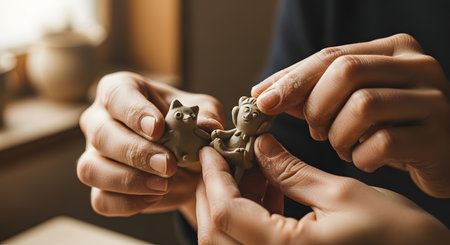 Close-up of artist's hands holding and shaping two tiny unbaked clay figurines. The detailed shot captures the delicate process of handmade pottery and sculpting in a creative studio.