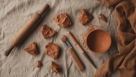 A vibrant and creative pottery workspace showcasing various clay bowls, sculpting tools, and a textured circular surface. The warm tones evoke inspiration.