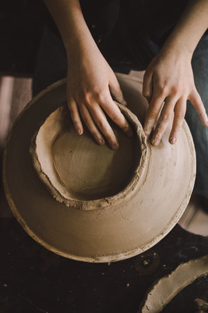 Hands of a potter. Potter making ceramic pot on the pottery wheel