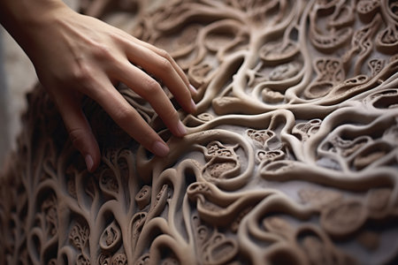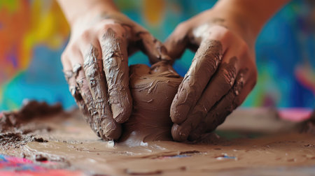 This image captures the intricate process of an artist shaping clay into a sculpture, emphasizing hands covered in earthy tones against a colorful backdrop.