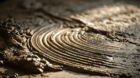Captivating close-up of wet concrete featuring elegant swirls and lines illuminated by soft natural light, ideal for design, construction, and artistic projects.