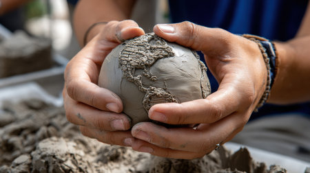 A person is holding a clay ball that looks like the earth. The person's hands are covered in clay, and the ball is shaped like a globe. Concept of creativity and playfulness