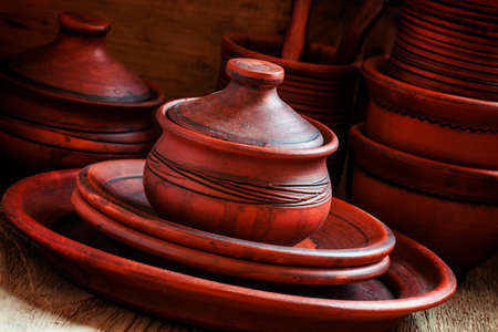 Earthenware on the table. Folk art.