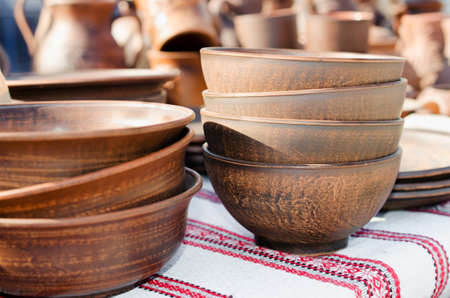 Ceramic products, traditional handmade souvenirs on the table. Crafts Fair. Selective focus
