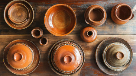 Top view of a rustic South Asian restaurant table with traditional clay serving pots. No people, copy space available