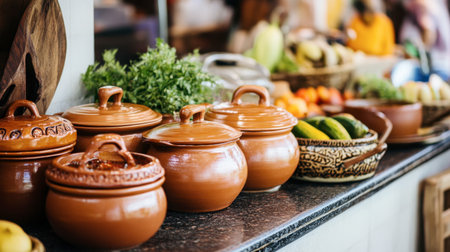 A beautiful arrangement of fresh ingredients in traditional pots, showcasing vibrant colors and textures, perfect for culinary inspiration and rustic settings.