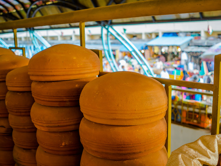 Clay jars at the market for food. close-up