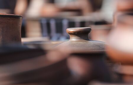 Handmade clay brown pots on a blurred background.