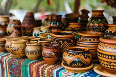 Beautifully decorated pottery displayed on a colorful rug at a craft market, showcasing traditional craftsmanship