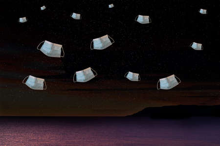 Healthcare and medicine concept. Used medicine face masks hanging like laundry on rope and fixed with colorful laundry pins in front of the blue and sunny sky with copy space