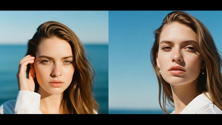 A young woman with long brown hair is featured in three different poses, standing in front of a serene body of water with a clear blue sky, wearing casual outfits and displaying various expressions.