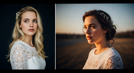 Two women, one blonde and one brunette, wearing white lace tops and floral headpieces, posing in different outdoor and indoor settings with distinct backgrounds.
