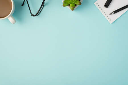 Top view photo of cup glasses flowerpot reminder pen on isolated pastel blue background with copyspace