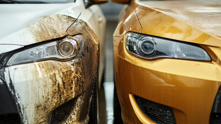 A dirty scratched vehicle stands next to a shiny polished car, showing the differences caused by proper care and maintenance over time.