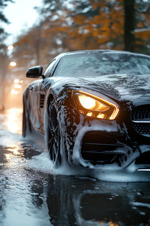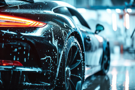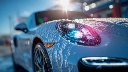 Shiny luxury sports car covered in foam at a car wash, symbolizing cleanliness, care, and automotive detailing.