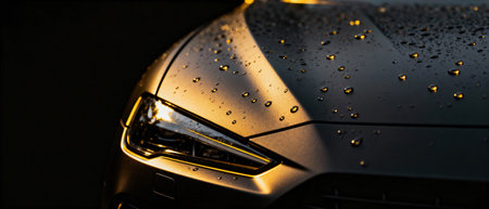 Close up view of a modern car headlight with raindrops.