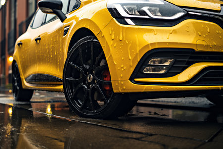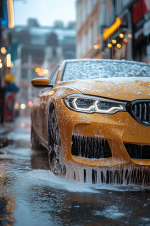 A vibrant yellow car is being washed on a rainy street in a bustling city. The reflective wet pavement adds to the atmosphere, with shops lining the background, creating a lively urban scene in the late afternoon.
