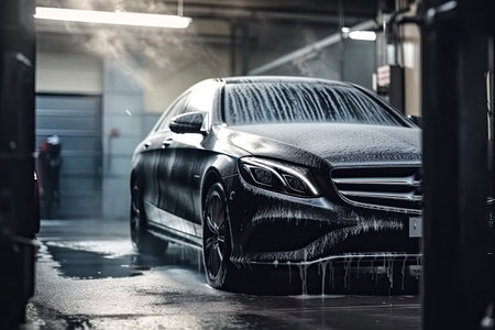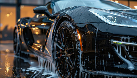 Professional car wash meticulous shampooing of sleek black sports car for ultimate shine