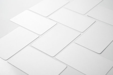 Mockup of a fanned stack of business cards on a white textured paper background, high-angle shot, minimalist style