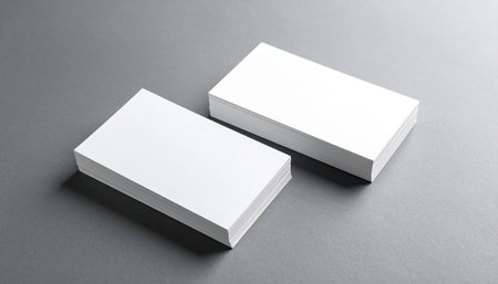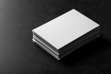 Two neat stacks of blank white business cards rest on a smooth, dark gray surface, ready for branding or design.