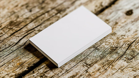 A white card is sitting on a wooden table. The card is blank and has no writing on it. Concept of emptiness and potential, as the card is waiting to be filled with words and ideas