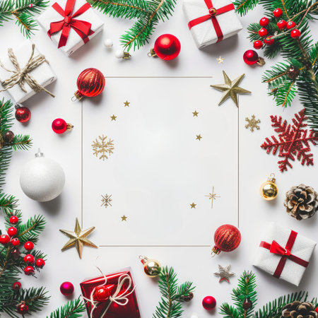 A beautiful holiday frame featuring decorated gifts, pine branches, and festive ornaments. Perfect for seasonal greetings or promotional materials.