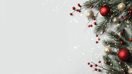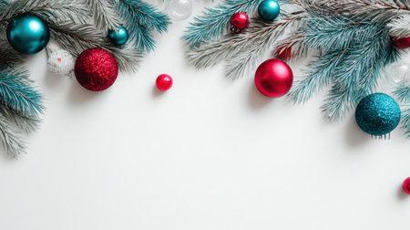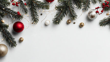 An overhead view displays a holiday composition featuring green evergreen branches and scattered red and silver ornaments. The bright white background provides ample copy space. This image evokes feelings of celebration and winter, suitable for various seasonal or festive design needs.