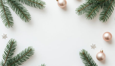 Evergreen branches and pastel baubles frame clean white center. Minimal festive winter background for text or design.